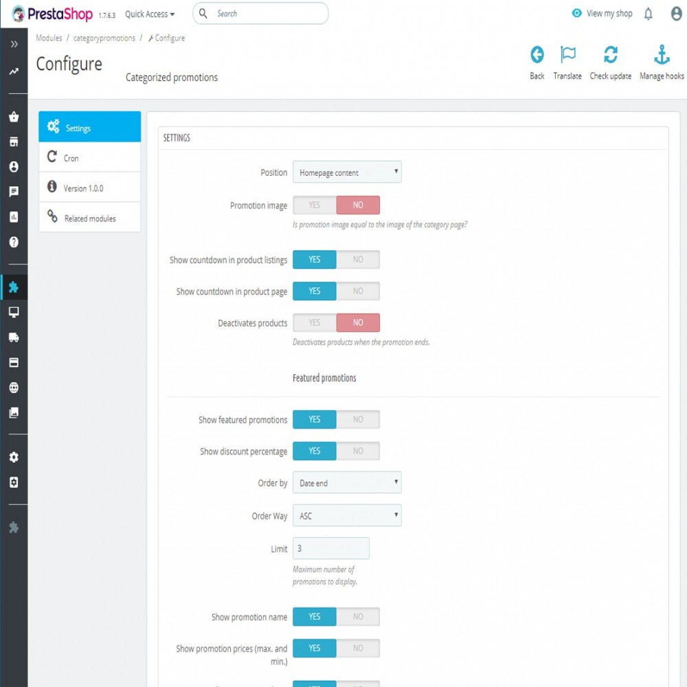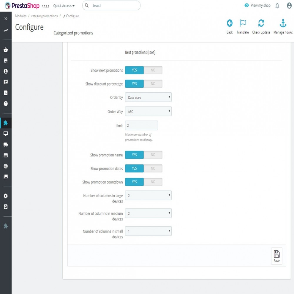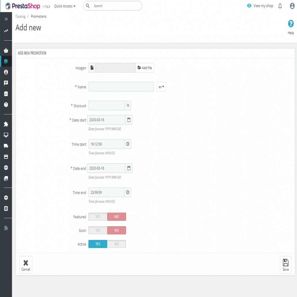 - Indicate in which position the promotions will be shown. Currently, it can be positioned on the home page, in the main content (above) and in the main content (below).