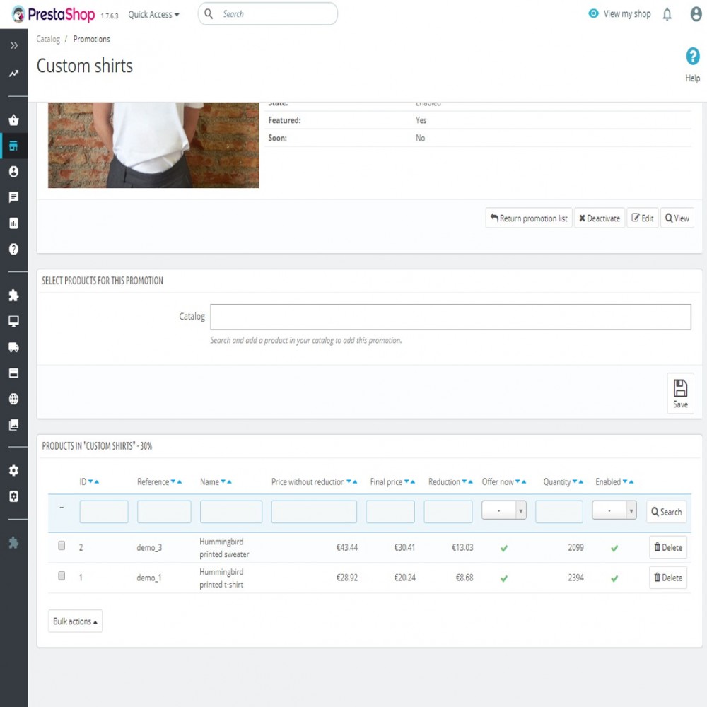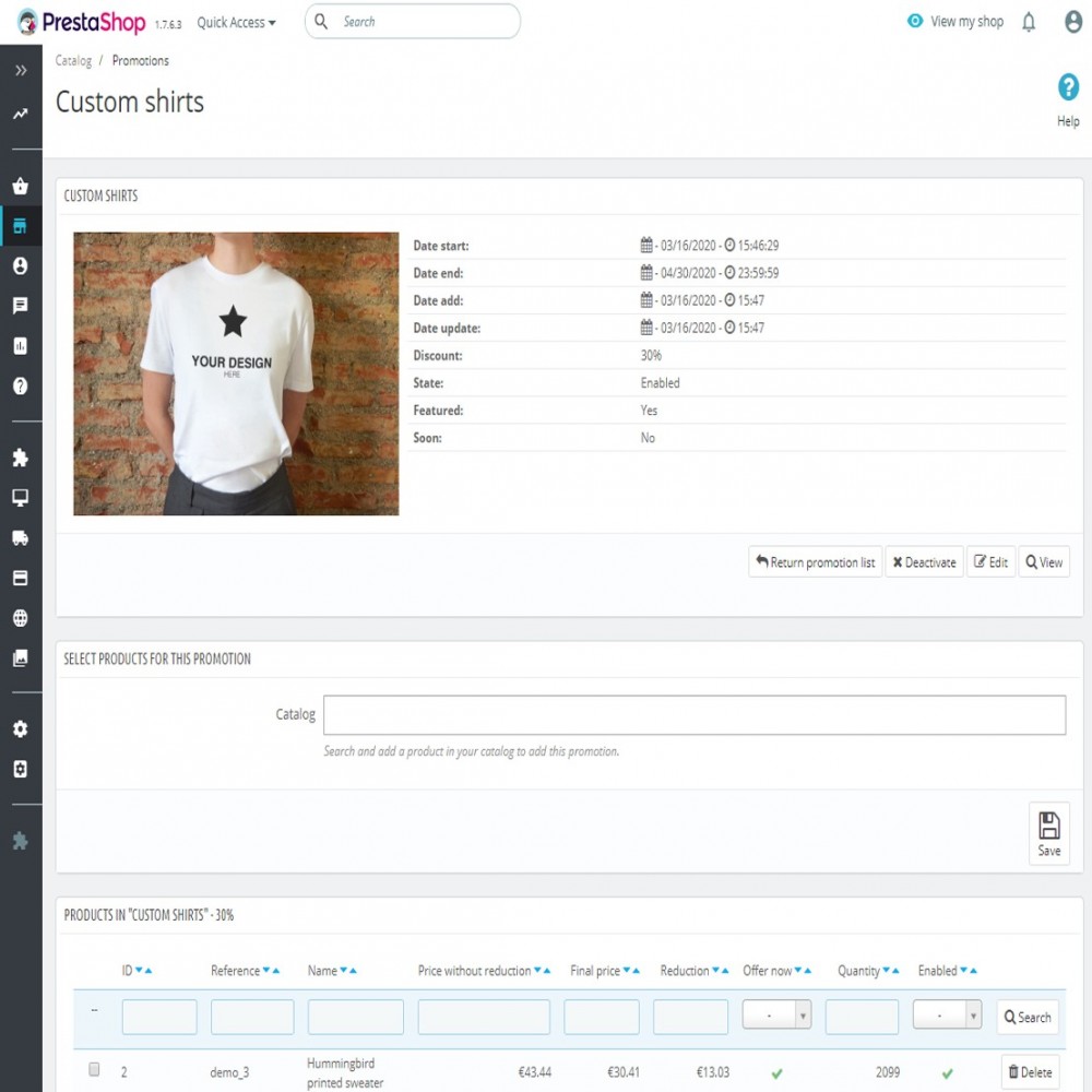On this page you have the possibility to return to the list of promotions, deactivate, activate or edit the promotion and view it on the front.