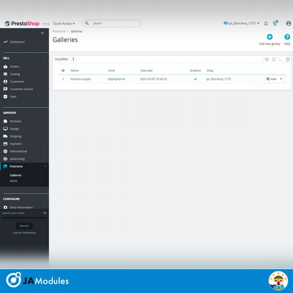 This module creates a new section within the administration of the store where you can manage the galleries and graphic elements that compose it.