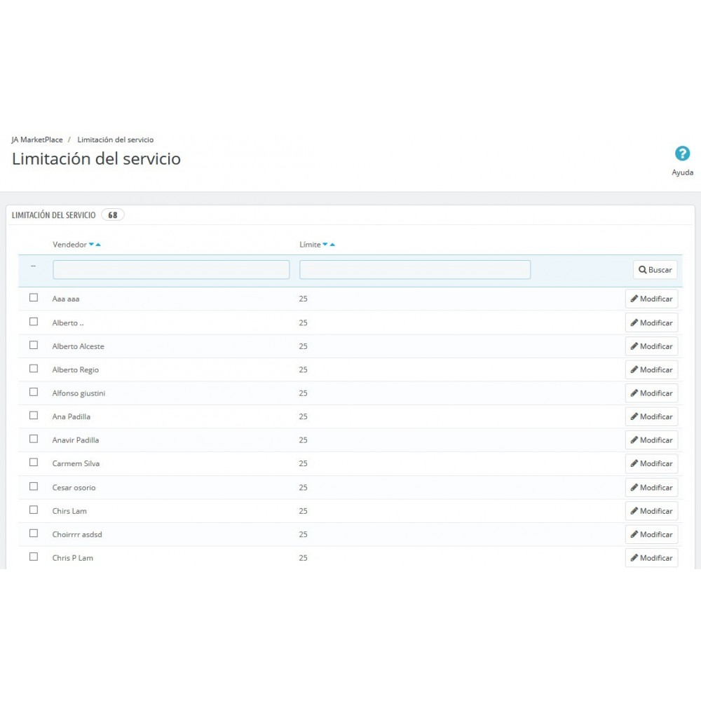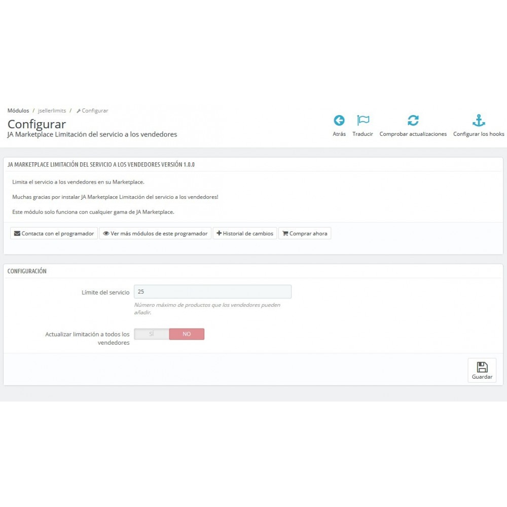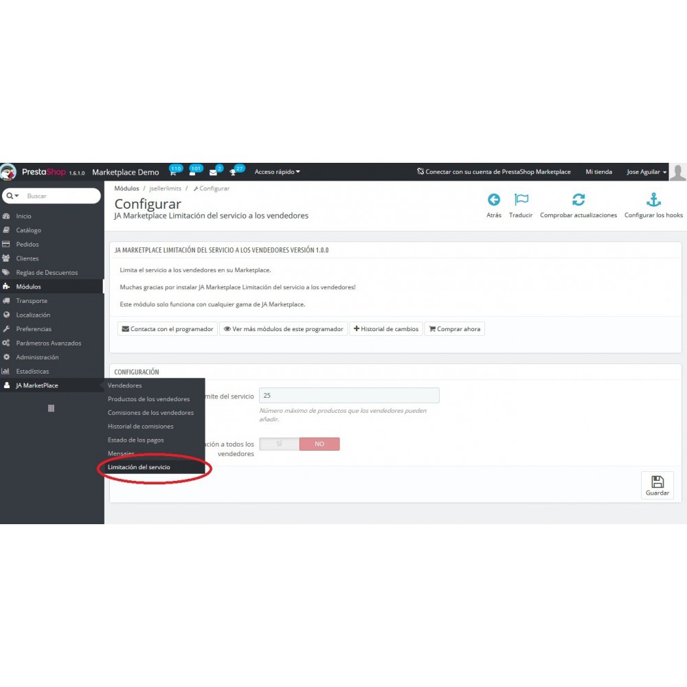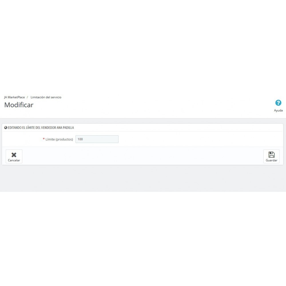 Dans le menu de gestion de JA Marketplace apparaît un nouveau lien « Limitation du service » qui vous permet de modifier la limite de produits à publier individuellement à chaque vendeur.